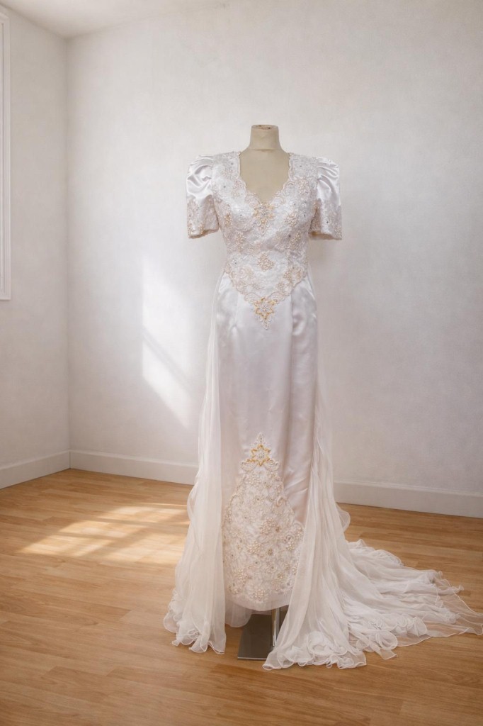 Abito D Sposa Corpetto Lavorato Perline Pajettes Raso Tubino Coda