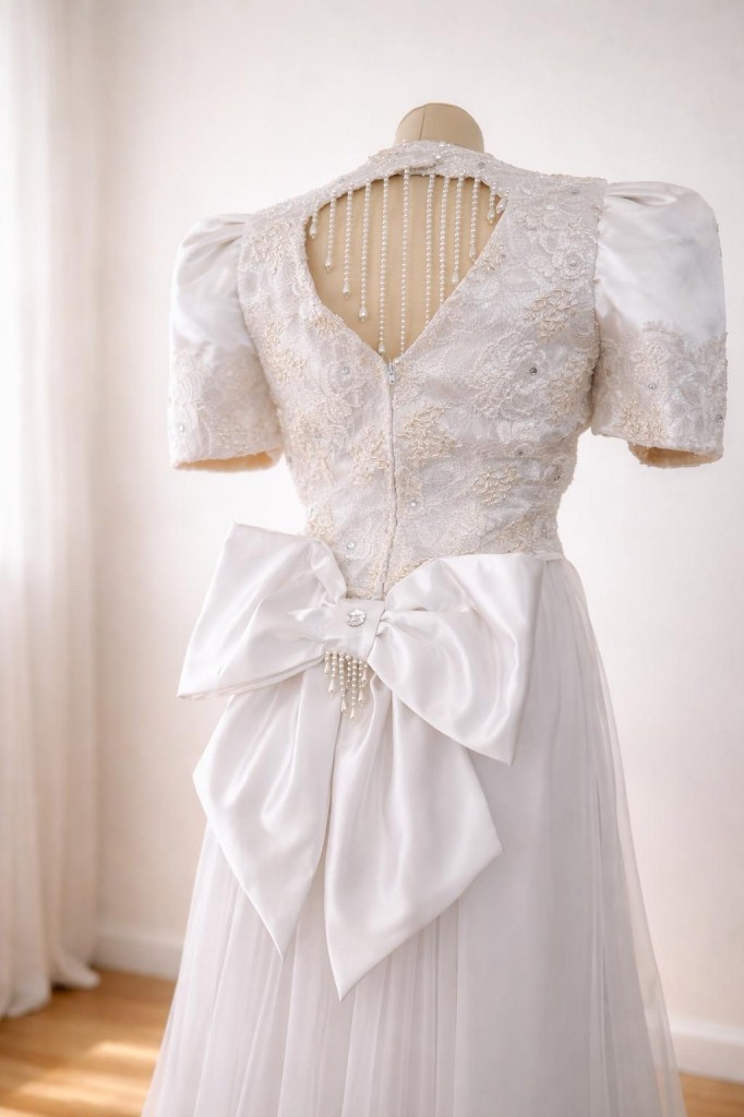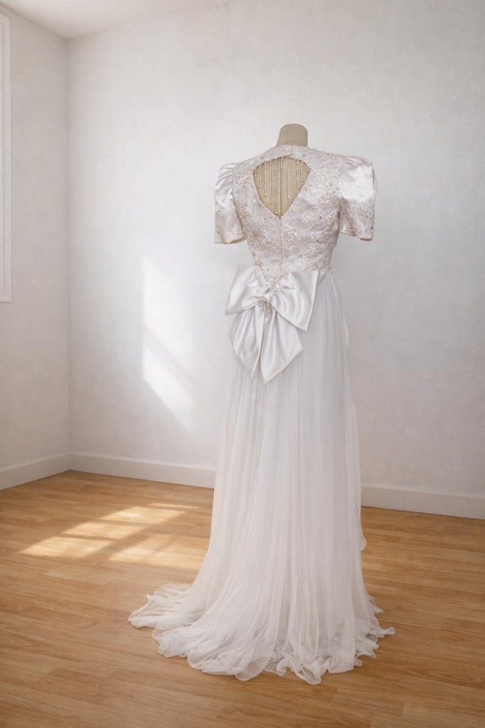 abito da sposa tubino bianco con applicata coda e fiocco.